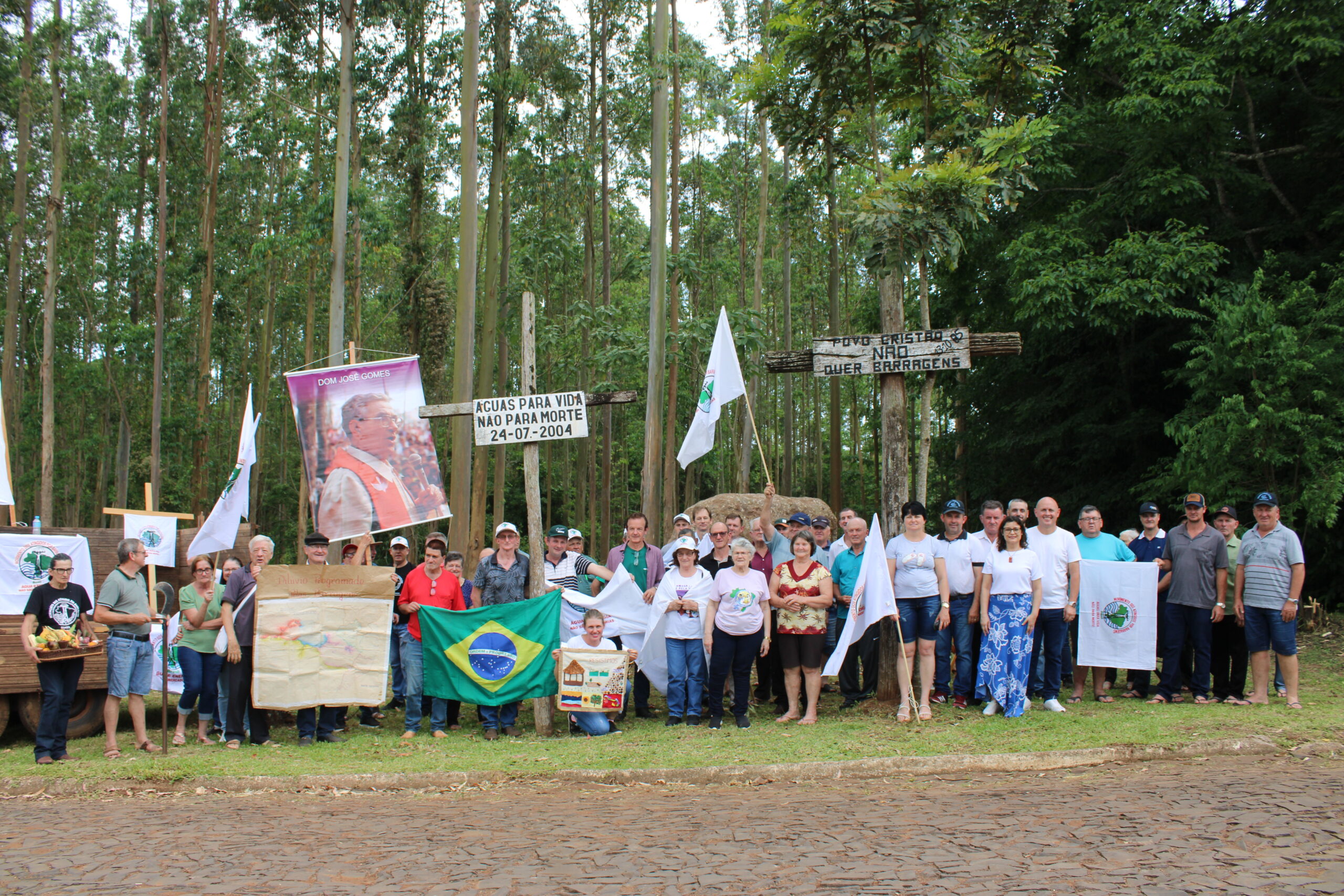 Em seguida, a militante Francine Kuffel, também do MAB, conduziu um momento de mística popular, relembrando os símbolos que representam a essência da luta. Entre os momentos mais marcantes, houve a lembrança do papel do bispo Dom José Gomes, figura central no apoio à mobilização dos atingidos. Nos anos 1980, ele convocou um abaixo-assinado histórico contra os projetos de barragens na Bacia do Rio Uruguai, recolhendo mais de um milhão de assinaturas.