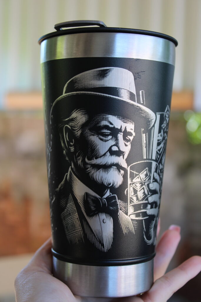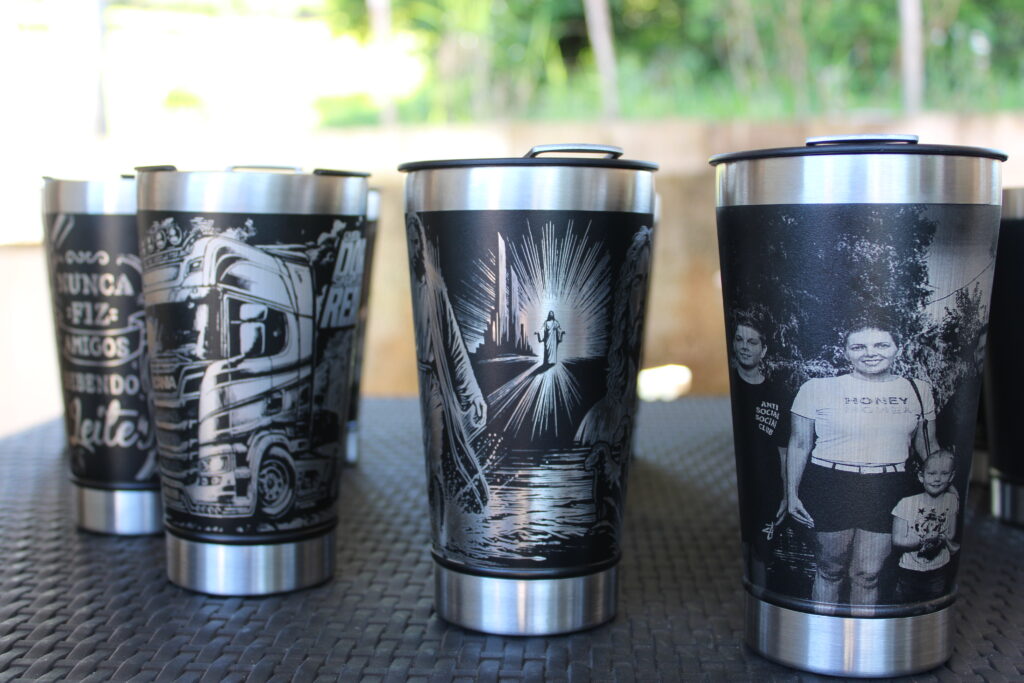 Os copos mais populares são os pretos, que, segundo o empreendedor, oferecem o melhor resultado no processo de gravação a laser. “Outras cores até dá pra fazer, mas a máquina detecta melhor o preto, e o acabamento fica mais bonito e durável”, explica. Além dos copos e facas, o negócio também oferece afiadores e outros acessórios, sempre com o objetivo de trazer opções práticas e criativas para o público.