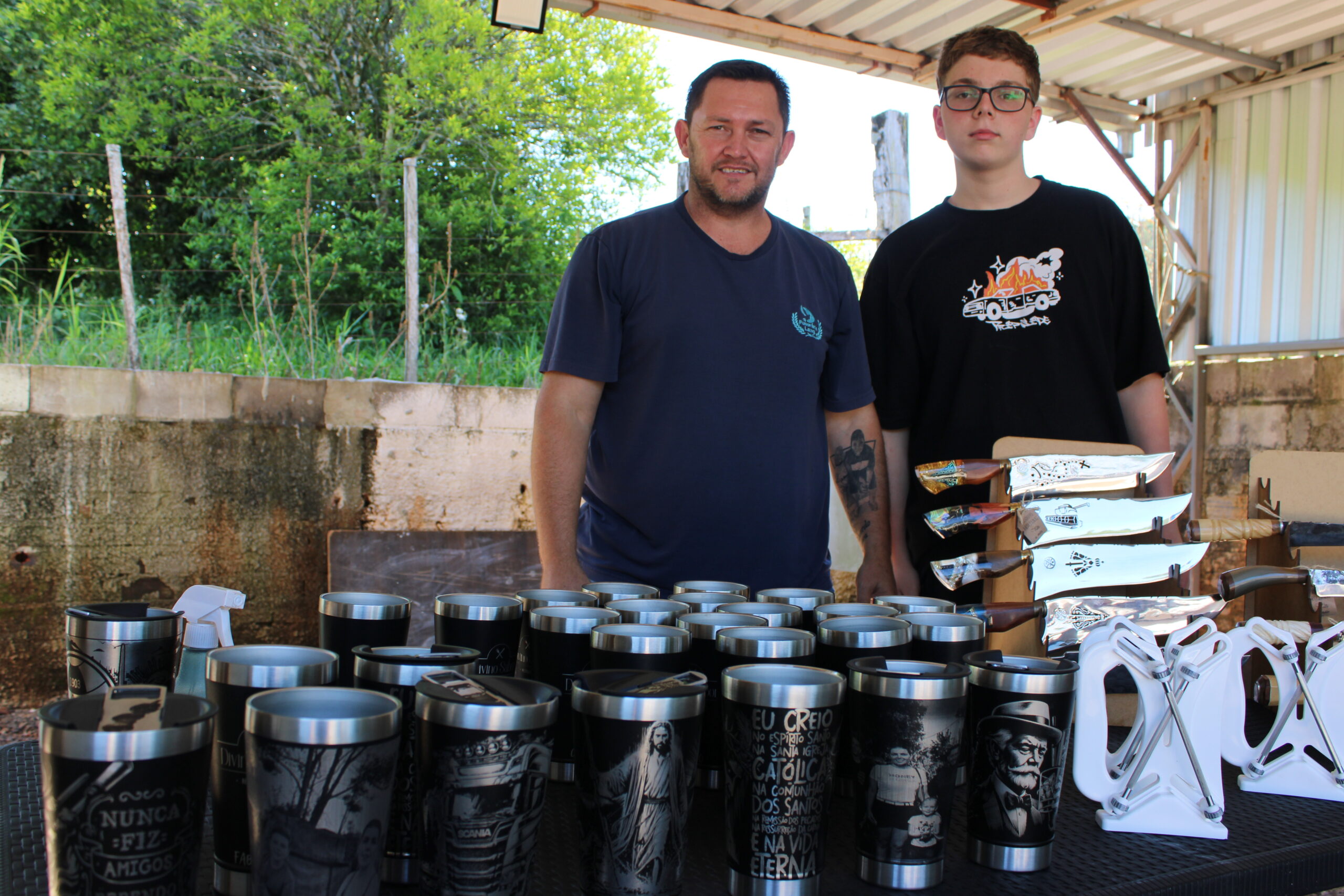O investimento na máquina foi o início de uma nova fase para o empreendimento familiar. Os copos podem receber nomes, frases, logos de empresas ou até emblemas de times, conforme o gosto do cliente. A produção é totalmente local, garantindo agilidade e exclusividade. “A gente faz tudo aqui. Dá pra gravar o nome na faca ou no copo, do jeito que a pessoa quiser. É um trabalho personalizado mesmo”, explica Eduardo.