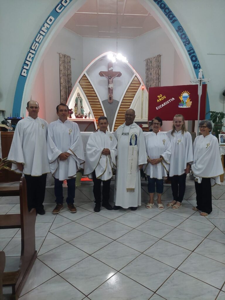 São João do Oeste – Em 20 novembro João Luís Flach, de 74 anos, completou 50 anos da sua formação e atuação como ministro da palavra e da eucaristia e 40 anos também como ministro de batismo. Alusivo a data, recebeu uma homenagem prestada pela comunidade de Catres, Mondaí, onde atuou na função por 40 anos. Há 10 anos, continua exercendo o cargo voluntário na paróquia de São João do Oeste, cidade onde reside com a esposa Maria. Também na paróquia de São João, foi homenageado em novembro, junto com outros ministros, pelo tempo de trabalho dedicado a igreja.